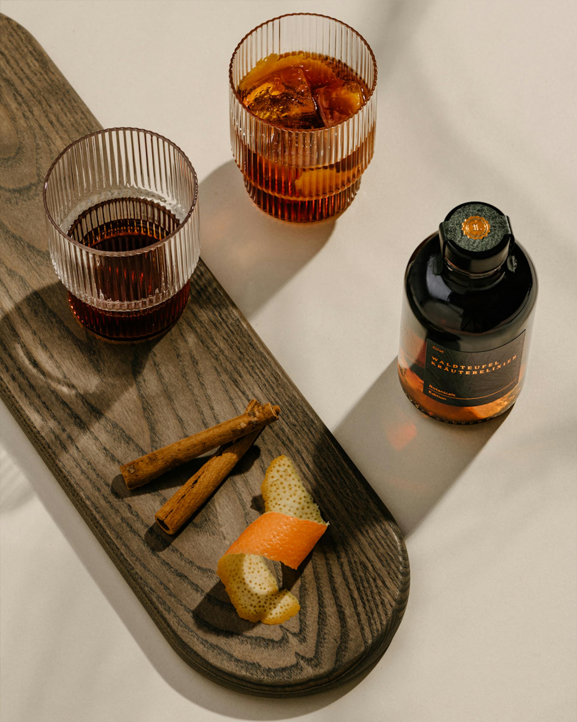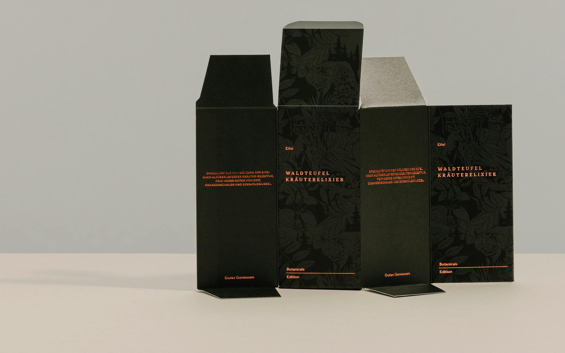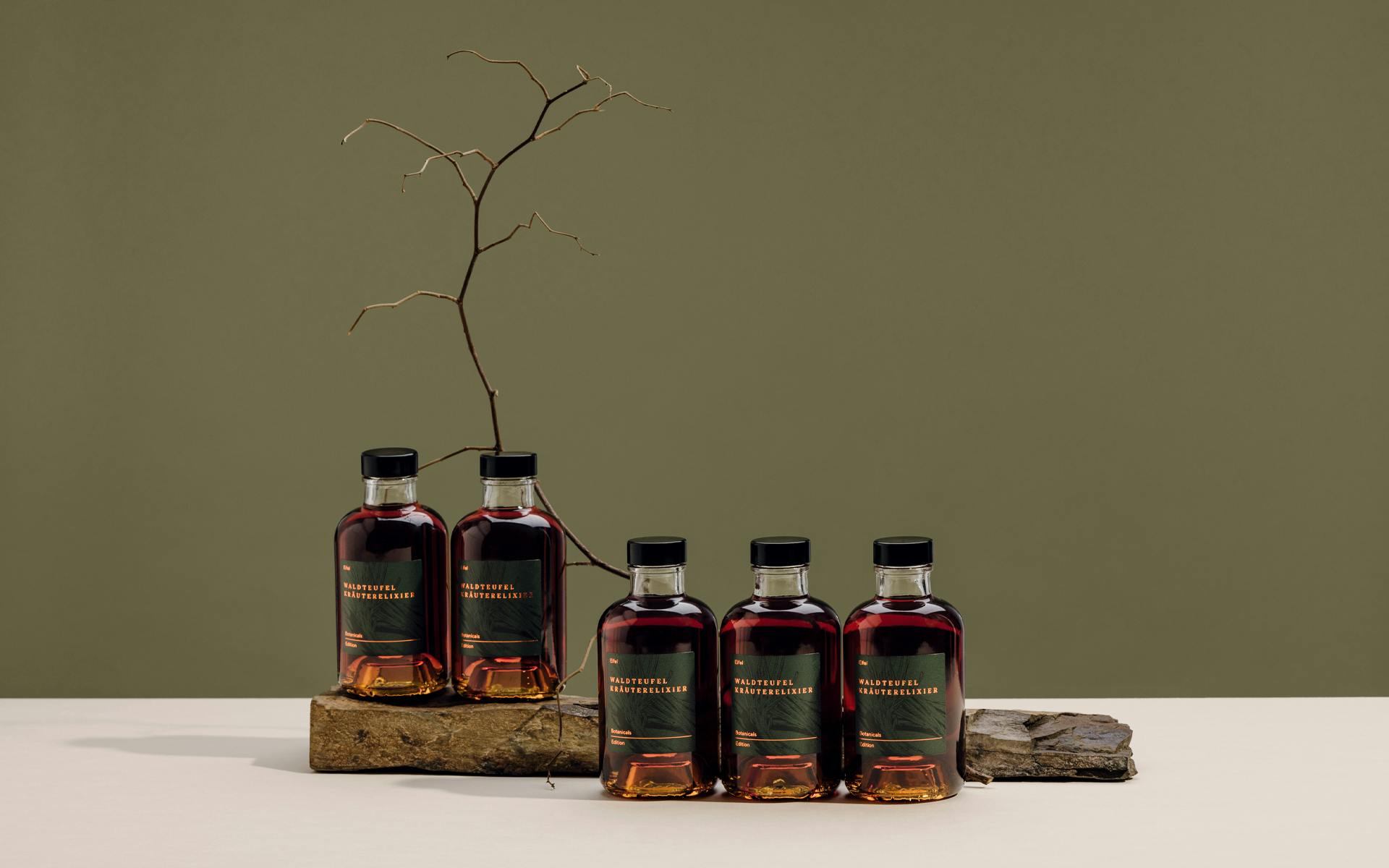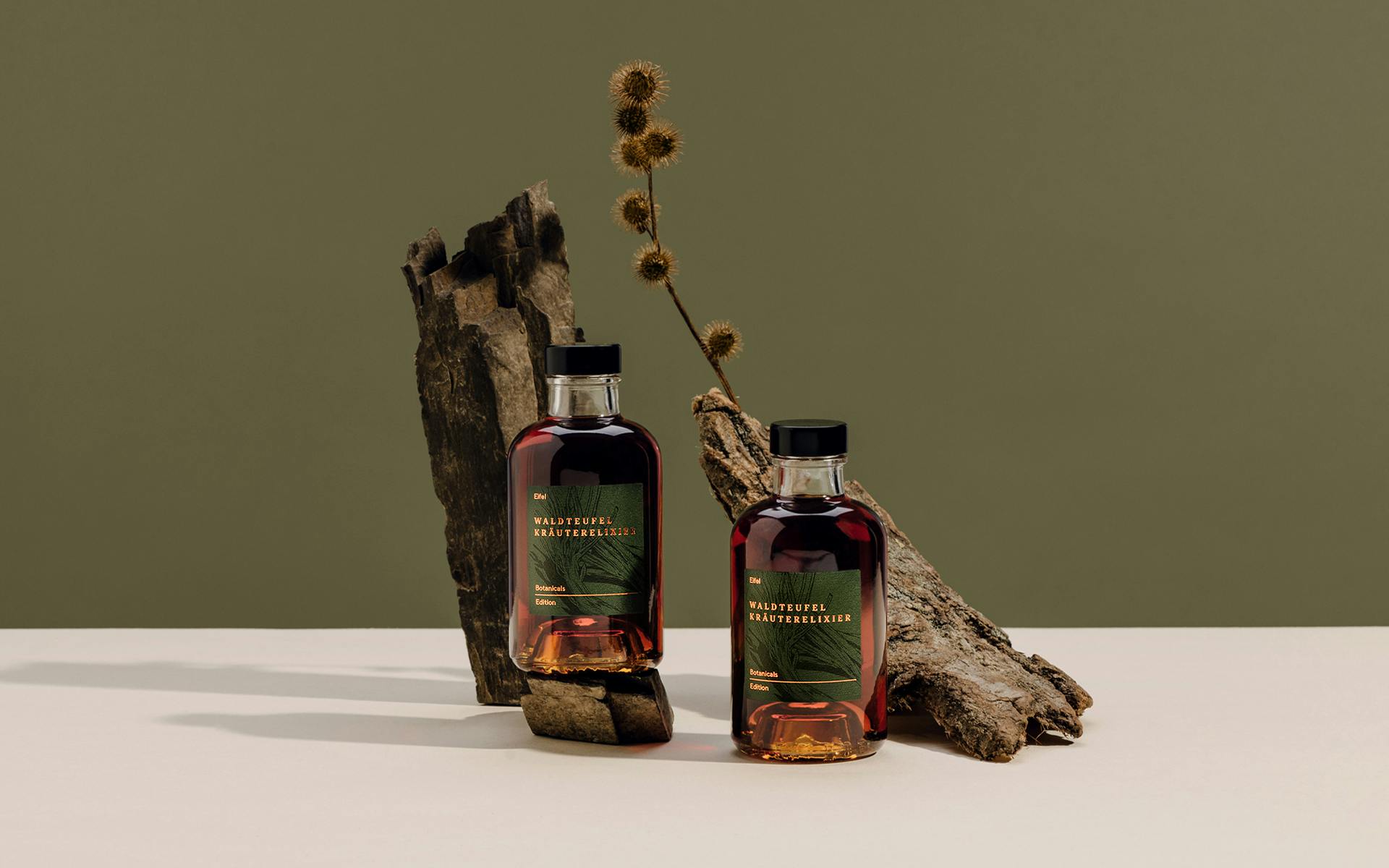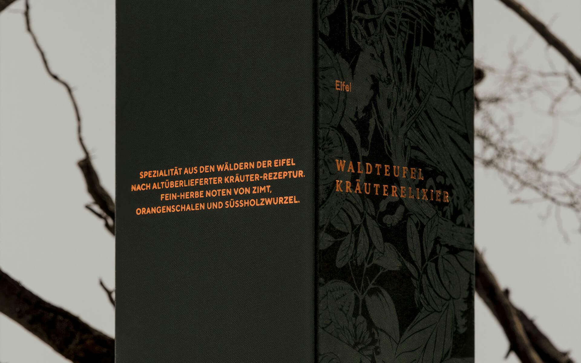 Re-Branding einer Spirituosenspezialität aus den Wäldern der Mosel. Alleinstellungsmerkmal des Produktes ist die traditionelle Kräuterrezeptur und die seit Generationen regionale Verbundenheit. Diese Herkunftsgeschichte ist die Basis des Gestaltungskonzepts.